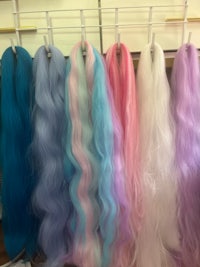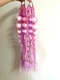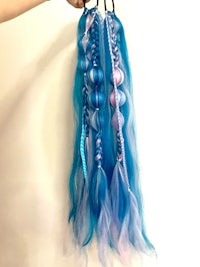 I once used the pink hair to create these extensions, but decided to redo them using these floral foam balls from dollar tree because the last extensions were HEAVY. I use the carabiner to clip the hair to something so I can pull it taut, and I use corresponding bands to create various styles!